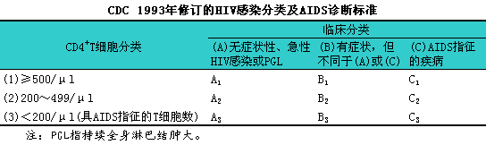 美国疾病控制中心(CDC)1993年修订的在青少年(年龄≥13岁)和成人中HIV感染分类及艾滋病(AIDS)诊断标准,l采用了临床分型结合CD4+T细胞计数的分类方法(见MMWR,l1992,l41/RR-17),l其主要内容为:i