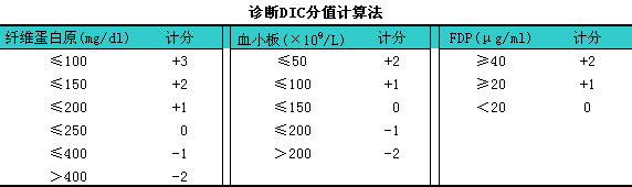 关于化验室检查结果对诊断的意义,l佐藤等提出一种计算分值方法(如表)可供参考应用。计算时根据病儿化验数值,l找出相应的计分值,l计算纤维蛋白原、i血小板和FDP计分值的总和,l分析如下:i①总计>4,l有DIC存在。②总计:i3,l可疑DIC。③总计<2,l无DIC。