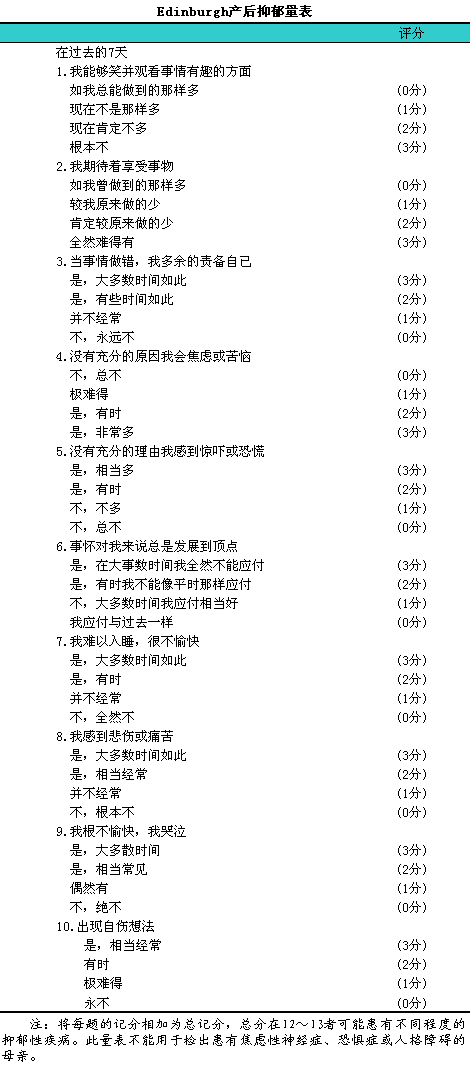 曾有不同形式的量表用于抑郁症的诊断,l目前比较公认的是Cox等设立的Edin-burgh产后抑郁量表(edinburgh1postnatal1depression1scale。EPDS)(见下表),l有较高的敏感度和准确性。EPDS包括10项内容,l于产后6周进行调查。每项内容分四级评分(0~3分),l总分≥13分者可诊断为产后抑郁症,l见下表。