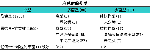 为了便于在基层开展联合化疗,l世界卫生组织、i建议把马德里(MadrId)或雷德里-乔普林(RId-1eyjoplIng)的麻风病分型法归纳为两型,l即多菌型(muhIbacIllary1leprosy,lMB)和少菌型(paucIbacIllary1leprosy,lPB)麻风(见下表):i