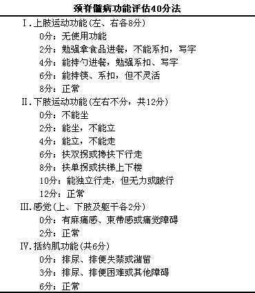 JOA117分法虽具有简捷、i便于记忆的优点,l但在实际使用中尚欠精确。原北京医科大学第三医院骨科参考JOA117分法并结合临床的实际状况制定并发表了颈脊髓病功能评定的40分法(见下表),l即将四肢功能按上、i下及左、i右侧分别评分,l且按每10分一个等级将肢体功能分为4级,l与残疾标准的划分相平行,l此方法似更具实用性。