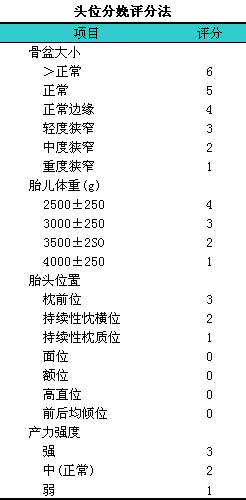 作者的初步论点,l骨盆加胎儿体重的分数达8分时,l为正常;7分为正常边缘;6分为头盆不称;6分以下者为明显头盆不称。当发现产程停滞时,l应做阴道检查确定胎头位置,l并结合当时的产力,l进行一次总评分,l包括骨盆、i胎儿大小、i胎头位置及产力4项。总分在10分以下者,l一般需考虑剖宫产术510分及10分以上者可以继续试产,l试产失败再考虑做剖宫产术。