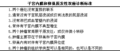 在Ulbright和Roth的诊断标准的基础上,l1987年,lYoung和Scully提出了一个较为完整的子宫内膜和卵巢原发性双癌的诊断标准(见下表)。以区别子宫内膜癌伴卵巢转移,l卵巢癌伴子宫内膜转移和子宫内膜和卵巢同是转移癌。Young和Scully认为如果子宫内膜癌浸润至深肌层及淋巴管和血管,l如果肿瘤累及输卵管黏膜,l侵犯卵巢的表面和它的淋巴管及血管,l那么卵巢的癌变很可能是继发性的。反之,l如不存在淋巴管和血管的转移,l子宫内膜癌很小,l局限在子宫内膜或仅有浅肌层浸润.在其周转又可见子宫内膜不典型增生的表现,l卵巢的肿瘤又是局限在卵巢的中心。常伴有子宮内膜异位症。那么这两个肿瘤很可能是原发肿瘤。Young和Scully的观点和诊断标准现已被广泛接受,l采用这个标准进行诊断时,l约有1/3的子宫内膜和卵巢同时癌变的病例被诊为子宫内膜和卵巢原发性双癌。尽管大多数子宫内膜和卵巢原发性双癌是子宫内膜样癌,l但是非子宫内膜样癌,l例如黏液性癌、i透明细胞癌,l也可偶尔出现。有时,l两个肿瘤的组织学类型也可不同。