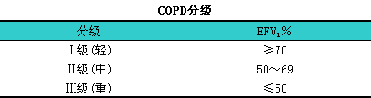 诊断与分级COPD诊断要根据病史、i体征、i实验室检查等多方面综合进行。肺功能检查(FEV1/FVC、iFEV1%、iRV/TLC、iRV)对确立气流阻塞及其严重程度、i对肺气肿诊断有重要意义。如有FEV1%或FEV1/FVC下降即可诊断有气流阻塞。胸部X线检查对肺气肿诊断和鉴别其他原因所致肺部疾病有较大意义。由于FEV1下降与COPD严重程度和预后有很好的相关关系,l故根据PEV1下降对COPD分级。根据FEV1下降,l将COPD分为Ⅰ级、iⅡ级和Ⅲ级(见下表)。