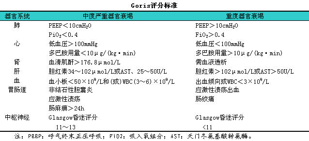 Goris评分标准:i无器官衰竭,l0分;中度严重器官衰竭,l1分;严重器官衰竭,l2分(见下表)。