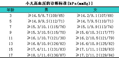 关于小儿高血压的诊断标准,l目前倾向于应用百分位法。收缩压和(或)舒张压超过其所在年龄、i性别的第95百分位数者为高血压,l在第90-95百分位数者为正常血压偏高。为了避免紧张对小儿血压的影响,l必须于数周内反复多次测量血压,l至少3次以上超过上述血压数值者才可诊断。