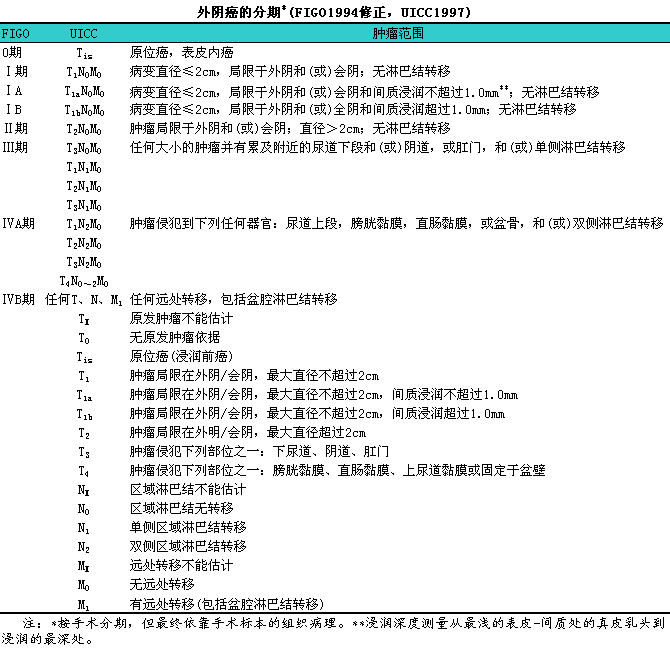 原发性外阴癌的临床分期主要参照1994年FIGO的手术病理分期和1997年UICC的TNM分期法。现综合叙述于下表。
