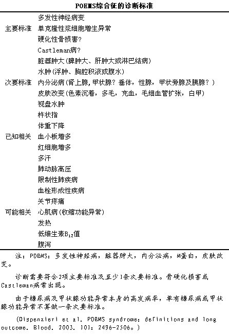 POEMS综合征是指出现外周神经病变(P)、i单克隆性浆细胞病(M)及其他症状的一组综合征。本病主要临床表现为多发性神经病变(P)、i脏器肿大(O)、i内分泌病变(E)、iM蛋白(M)和皮肤改变(S)。