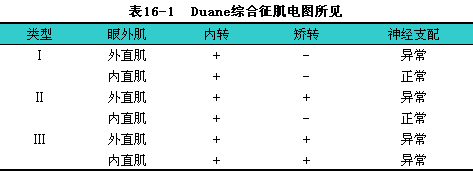 根据肌电图检查所见,lHuber将该3型眼球后退综合征整理如下表。另外有关本征的病因有中枢方面外转神经核形成不全,l外直肌受动眼神经支配形成异常神经支配以及外直肌的挛缩造成肌肉松弛障碍。