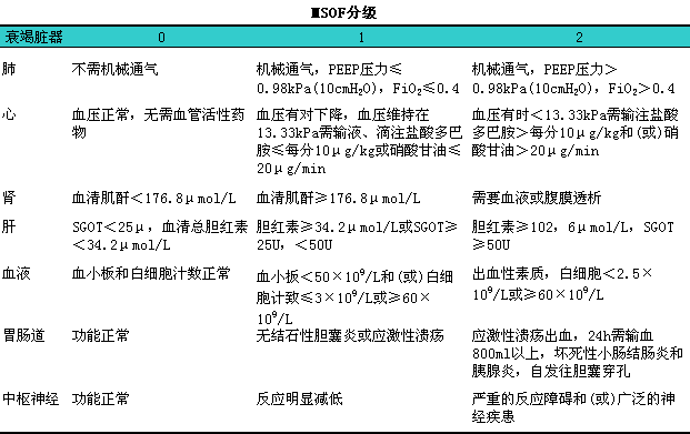 文献上有数种MSOF病情轻重的分级标准,lGoris(1985)提出用记分法估测MSOF的轻重程度,l见下表,l0级为没有脏器衰竭,l1级为中度衰竭,l2级为重度衰竭。按各级次分别计分,l总分最低为0分,l最高为14分。