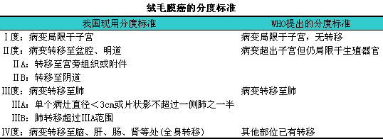 绒毛膜癌为一种高度恶性肿瘤,l国际采取1983年WHO提出新的分度法,l国内目前多采用北京协和医院制定的分度标准(见下表)。