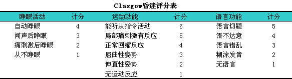 1974年,l英国Glasgow神经科学研究所南方医院神经外科Teasdale和Jennett制订了一个昏迷计分表,l用以测定病人昏迷的深度,l其主要指标为:i①睁眼活动。②运动功能。③语言活动(见下表)。