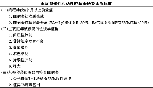 1988年,lStraus提出的诊断标准如下表。表中第1项持续6个月以上的重症无明确标准,l包括发热,l明显淋巴结、i肝脾肿大,l肺炎,l关节炎,l慢性活动性肝炎,l溶血性贫血,l骨髓功能障碍,l原因不明的皮疹及VAHS等症状;包括EA抗体阳性的EB病毒抗体效价,l如持续升高可诊断。婴儿期初感染1EB病毒成为迁延者,lEB病毒抗体效价变低。因各单位所验结果差别很大,l故不可单纯依照表的抗体效价作出诊断,l最重要的指标是抗体反应从正常到显著异常。