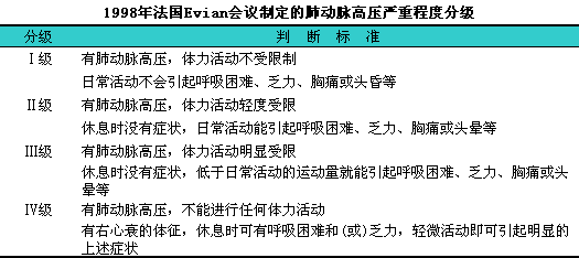 1998年,lEvian会议上还根据NYHA心功能分级方法,l制定了PH严重程度的分级建议(见下表),l2003年威尼斯会议仍沿用此建议。有利于医师根据PH的严重程度进行规范化治疗,l正确评价患者预后。