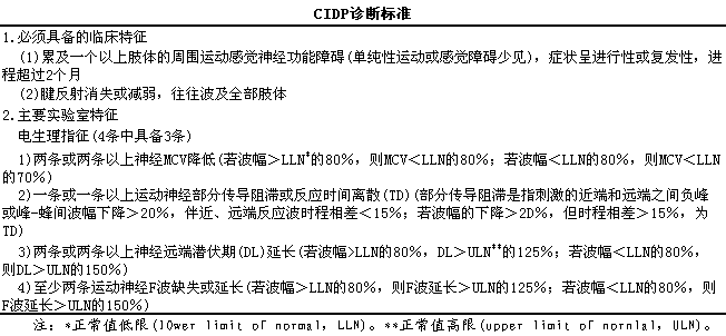 1991年1,1美国神经病学会对CIDP诊断标准进行修改后制定了新的标准(见下表)。表中“必须具备的临床特征”是诊断CIDP的前提,l若同时具有全部主要的实验室特征,l可确诊为CIDP;若仅有两条实验室特征,l则可能为CIDP;若仅有一项实验室特征,l则为可疑CIDP。