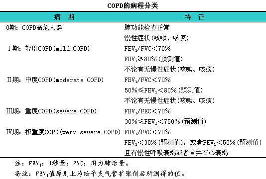 根据肺活量计测定的结果,l可对COPD进行病程分类(表3-25)。值得注意的是,l这里把肺活量计测定完全正常但有慢性咳嗽、i咳痰的情况列为COPD高危人群。