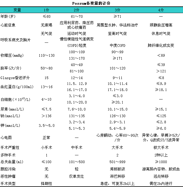 评估死亡率和发病率的生理和手术严重性评分(Possum)包含了12个生理学参数和6个手术严重性评分(见下表)。与APACHEⅡ相比,