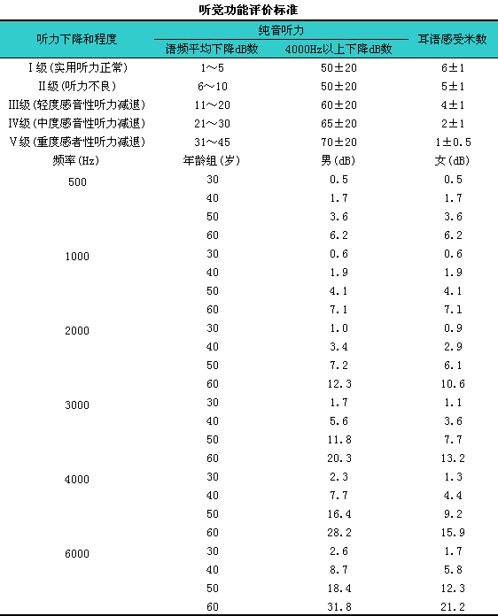 2.由于人类的纯音听力随年龄的增长而下降,l因此在计算职业性噪声所致的听力损失时应扣除其年龄因素的阈值变化。在18~30岁以内的年轻人,l对一般听力计测试范围内各音频的听敏度男、i女两性无差别,l但在较大的年龄组,1则两性之间便显出差异,l且年龄越大,l差别也越大。我国人的这种随年龄增长而使听阈提高的标准数值,l亦即年龄修正值,l据悉有关部门正在研究制定,1正式公布尚需时日。兹摘录1SO/DIS7029附件B不同年龄组相对于18岁正常人听闻变化的50%中值的有关数据如前表,l可供参考。
