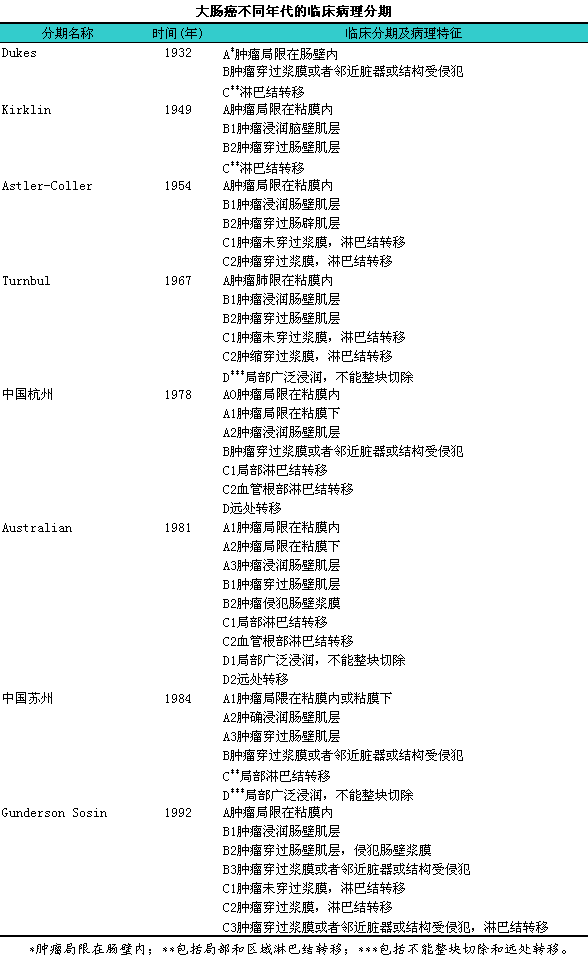 1949年,lKirklin根据肿瘤浸润肠壁的深度把局限在粘膜层的肿瘤确定为A期;肿瘤浸润肠壁肌层,l无淋巴结转移定为B1;肿瘤穿过肠壁肌层,l无淋巴结转移为B2;有淋巴结转移为C期。