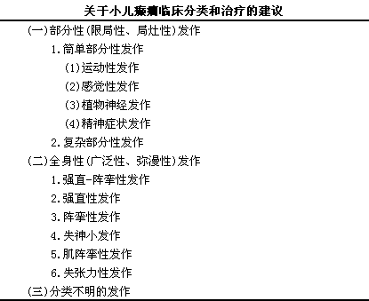 我国小儿神经工作者在1983年四川I省自贡市举行的专题讨论会上,l参考1981年ILAE提出的分类标准,l结合我国的实际情况将该分类方法进行了简化,l提出了小儿癫痫发作分类建议(见下表)。当时考虑到婴儿痉挛发作有其特殊性,l而且并不少见,l在癫痫发作中如不提及不太恰当,l遂在肌阵挛发作中提到“其中包括婴儿痉挛。