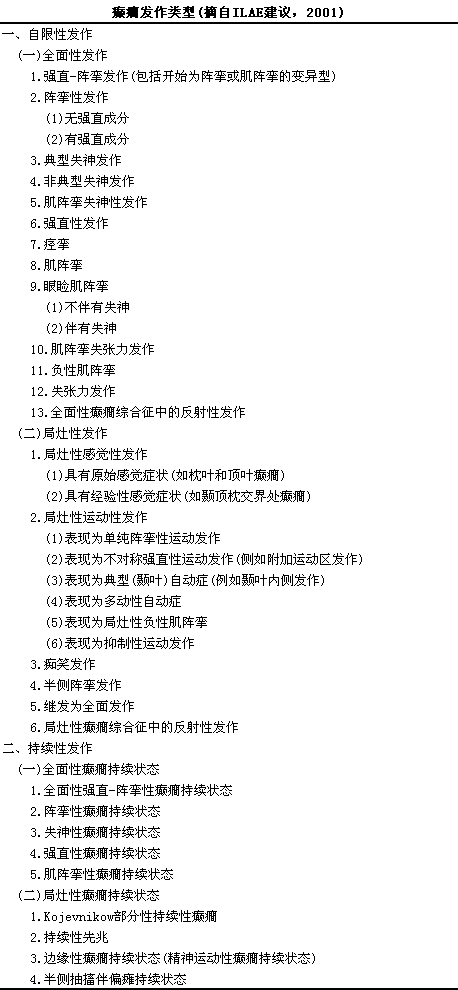 2001年5月,l在第24届国际癫癇会议上,l1ILAE又提出了关于癫癇发作和对癫痫诊断的建议,l其中关于癫痫发作的类型见下表。