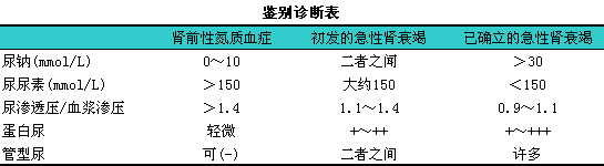 有人认为,l在肾前性氮质血症和已确立的急性肾衰竭(established1ARF)之间,l有一个过渡时期,l称为初发的急性肾衰竭(incipient1ARF),l此时仍未发生明显的ATN病理解剖变化,l如能于此时给予恰当处理,l则ATN可逆转或病情大为减轻,l其鉴别诊断如下表。