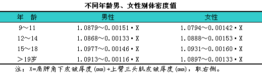 (3)脂肪百分率(F%)测定:i判断肥胖与否单凭测体重是不够确切,l主要看脂肪在全身的比例(见下表标准),l可按下列公式计算,lF%=(0.570/1D—4.142)×100。其中体密度(D)依照下表测算,l然后代入公式内。
