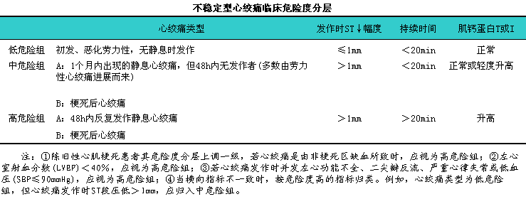 患者病情严重性的判断主要依据心脏病病史、i体征和心电图,l特别是发作时的心电图。病史中的关键点是1个月来的心绞痛发作频次,l尤其是近1周的发作情况。其内容应包括:i①活动耐量降低的程度。②发作持续时间和严重性加重情况。③是否在原劳力性心绞痛基础上近期出现静息心绞痛。根据心绞痛发作状况,l发作时ST段压低程度以及发作时患者的一些特殊体征变化可将UAP患者分为高、i中、i低危险组(见下表)。