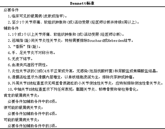 为了提高诊断的特异性,lBennett等结合PsA独特的临床表现与放射学检查特征,l提出了一个新的分类标准。在该标准中包括滑液分析和滑膜组织学检查。由于很难获得患者这些检查的完整资料,l所以该标准还没有用于前瞻性研究。