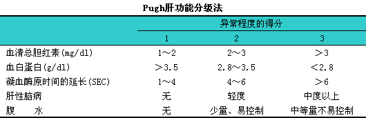 Pugh改良了Child分级法,l用“凝血酶原时间延长的秒数”替代“营养状况”这一指标,l并改变了原分级中以一项定全局的评级法而代之以评分法,l即以5项指标的总得分来综合评定肝功的好坏,l因此较Child分级更客观和合理(见下表)。