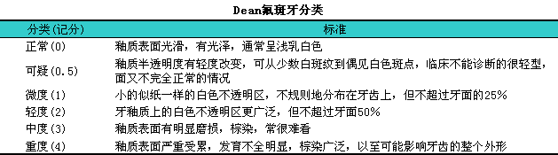 WHO推荐使用Dean分类法。Dean分类是根据牙齿表面光泽度及染色和缺损程度分类,l并对侵犯牙面的面积进行估计(见下表)。