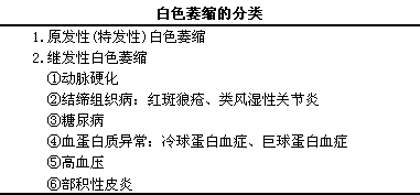 Stiefler认为白色萎缩像雷诺病和雷诺征一样,l既是一种疾病,l也可是一种非特异性的皮肤症状。因为某些疾病也可以产生萎缩性瓷白色斑和毛细血管扩张,l因此在诊断原发性白色萎缩时必须排除郁积性皮炎、i动脉硬化、i血蛋白质异常、i糖尿病、i高血压和胶原病等,l故Shornick于1983年提出把本病分为原发性(或特发性)和继发性两类(见下表)。