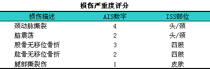 计算方法:i三个最严重损伤区的最大AIS最高代码平方后相加,l即为损伤严重度评分(ISS)。如某一严重多发伤伤员通过查AIS字典得出如下情况(见下表):i