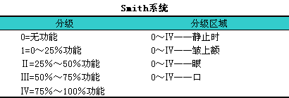 Smith系统(见下表)则简单地将评价分静态、i皱上额及眼和口四部分,l每部分以0表示无功能,l4表示功能正常,l每部分值之和用4除则为其得分,l然后再求其功能百分比,l每个区也可换算为功能百分比。