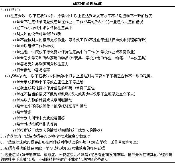 若患者在前6个月中的症状都符合A(1)和A(2)则为ADHD混合型,l若符合A(1)但不符合A(2)则为ADHD注意分散为主型,l若仅符合A(2)但不符合A(1)则为ADHD多动为主型。对于有些人(尤其是青少年和成人)现时尚有一些症状而不完全符合标准者应注明“部分缓解”。