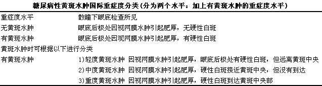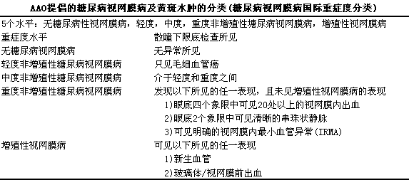 ETDRS(early1treatment1diabeticretinopathy1study)分类及应用于临床的重症分类对于使用ETDRS的分类,l眼底片摄影人以精确拍摄的7个方位立体眼的照片为基础,l专业评判者以此来决定水平,l此分类就成为以后DRP临床试验的标准。而且仿照此方法使用其简便方法的临床试验也很多(如UKPDS、iEURODlAB等)。一方面这种分类报道有很多证实,l另一方面由于此种分类在临床上不能应用,l实际中不适用。在这种背景下,l2002年,lAmerican1Academy1of1Ophthalmology(AAO)在ETDRS基础上,l报道了临床上能使用的糖尿病性视网膜病变及黄斑水肿的国际分类(见下表)。它是以ETDRS和Wisconsin1Epidemiologic1Studv1of1Diabetic1Retinopathy(WESDR)为基础制定的。今后国际上可能会更多使用这种分类。