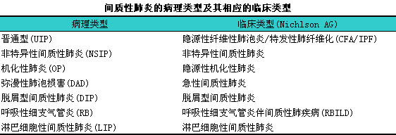 2002年,lNichlson认为既往对特发性间质性肺炎进行的分类,l由于术语大量重叠,l故各家分歧较大,l建议由临床医师、i影像学家和病理学家组成一个小组来统筹该病的分类。他确定了七个组织学类型,l即普通型间质性肺炎、i非特异性间质性肺炎、i弥漫性肺泡损害、i机化性肺炎、i脱屑性间质性肺炎、i呼吸性细支气管炎和淋巴细胞性间质性肺炎,l且每一种组织学类型都有其对应的临床分类名称(见下表)。强调诊断的金标准不再是单独的肺活检,l而是更详细的临床病理资料,l只有临床、i影像、i病理资料综合起来才能产生最后的临床病理诊断。