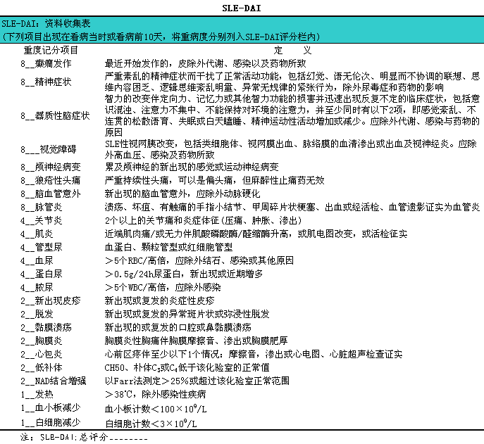 SLE-DAI是美国和加拿大的多数风湿病专家所选出的疾病活动性评价项目,l最后以统计学方法采用评分系统制成的活动性评分标准(见下表)。9个脏器病变(中枢神经系统狼疮、i血管病变、i肾脏、i肌肉、i关节病变、i浆膜炎、i皮肤病变、i免疫学改变、i发热、i血液异常)分别经回归系数处理,l按数量的大小分为4级(中枢神经系统狼疮、i血管病变为8分、i肌肉、i关节病变、i肾脏病变为4分,l浆膜炎、i皮肤病变、i免疫学异常为2分,l发热、i血液等异常为1分)。这些改变规定时限为近10d内的改变。从理论上讲1SLE-DAI以最高分105分来表示其活动性,l但有这种可能性,l同时满足上述项目的患者,l是很少见的。多数经对24个项目的数量化后在10~15分时即表示有活动性。这种活动性判断标准,l具有良好的稳定性与重复性,l但在临床应用时尚须注意其可信性。