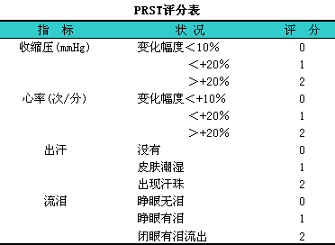 Russell曾利用PRST(血压、i心率、i出汗、i流泪)评分系统(见下表)进行麻醉深度监测。其结论是具有下述反应的情况50%是发生在PRST评分0分时,l只有1例病人在2分以上还存在术中记忆。