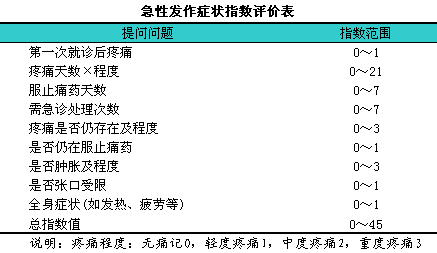 急性发作是根管治疗期间的常见并发症,l但对此仍无确切和统一的诊断指标。为便于对“急性发作”这一重要临床表现进行准确系统的研究,l作者设计了急性发作症状指数评价表(见下表)。其中每一相关指数都设至少两个不同的提问问题,l以保证患者尽量准确的描述自觉症状。