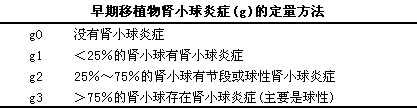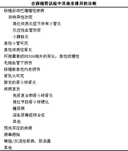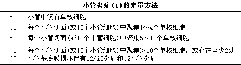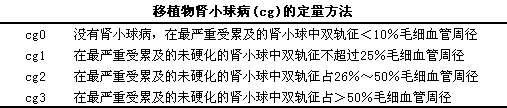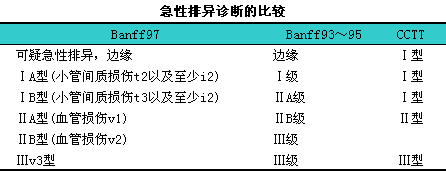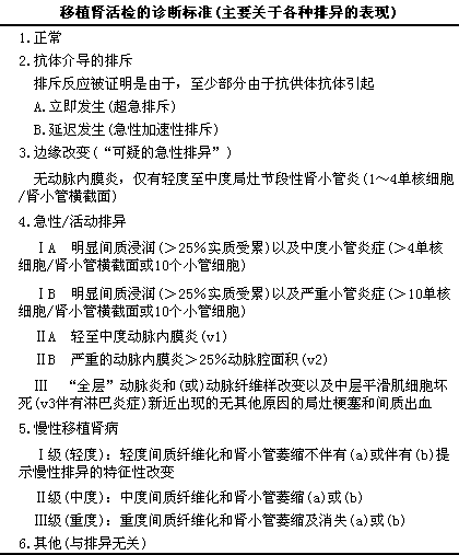 Banff分类标准见下表。它包括有超急排异、i边缘改变、i急性排异(分3级)、i慢性排异(分3级)和其他不代表排异的改变。随着人们对病理改变认识的提高,l此标准血将出现变化,l如目前肾小球炎不作为排异的特定表现,l因为目前尚不知道它对排异的意义。但已有报告认为如果在肾移植后的最初几个月出现肾小球炎将会缩短移植物的寿命。对于此分类标准中的“慢性移植物肾病”,l至少包括有4种目前用活检方法尚不能区分由疾病,l如慢性排异、i慢性环孢素A中毒、i高血压性血管病、i慢性感染和(或)反流。对于“急性”和“慢性”的概念今后还需要进一步修饰,l因为损伤和移植后时间均不足以完全定义这些名词。如若停用免疫抑制剂,l则即使数年后也可发生急性排异;同样如果供者有与年龄相关的血管疾病,l则可在移植后早期的活检中发现“慢性”损害,l所以目前“慢性”的定义也可用于新近发生的供者过去没有的损害。