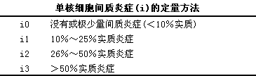在Banff标准中,l肾移植后急性排异的特异性改变为肾小管炎和动脉内膜炎。虽然在排异时最明显的损害常为间质的单核细胞浸润,l但许多研究显示在移植物功能稳定及正常期也可发现局灶或轻度弥漫性单核细胞浸润,l所以目前认为间质单核细胞浸润不影响移植物的存活率。有的作者还发现约80%环孢索A治疗的肾功能稳定患者有间质单核细胞浸润,l并且42%左右患者呈弥漫浸润,l所以单核细胞间质浸润不能作为排异的特异指标。