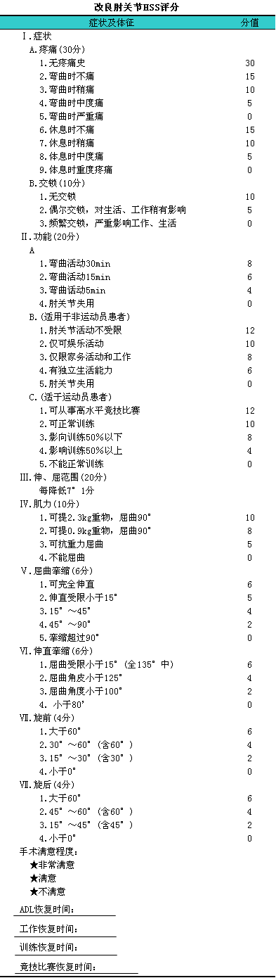 参照HSS肘关节评分系统(见下表)并加以改良后进行术后疗效评定。评分标准: