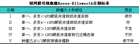 视网膜母细胞瘤(RB)Reese-Ellsworth分期标准见下表。