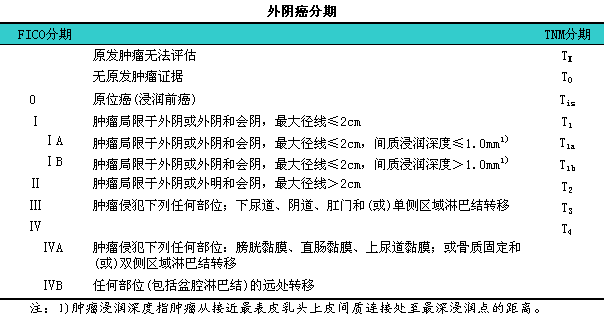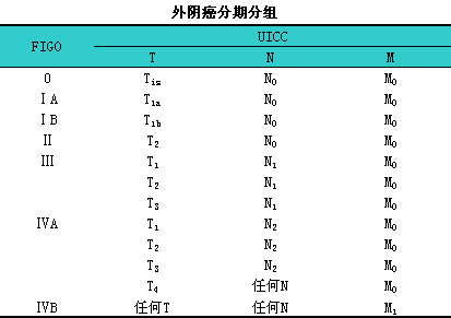 1988年起外阴癌采用手术分期,l1994年对工期再分亚期(见下表)。