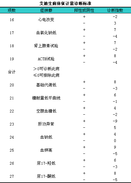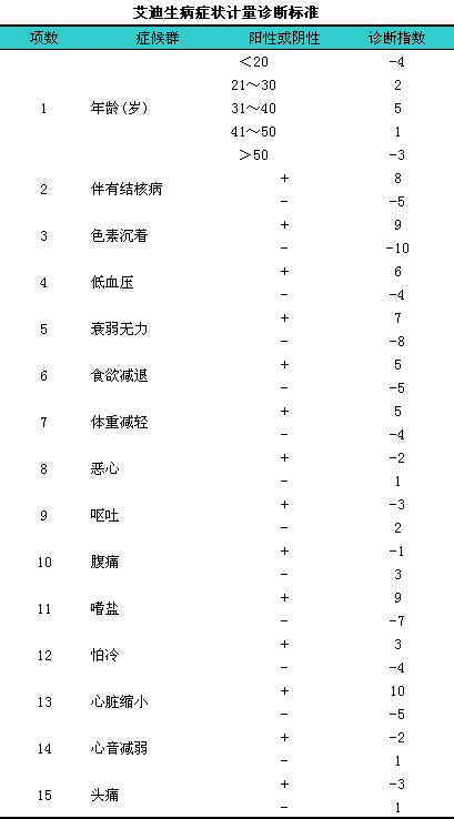 上表计量诊断表使用方法:i将病人出现的症状、i体征、i检验等的阳性或阴性结果,l根据表中相应的数字记下来,l然后相加。若其代数和>0者,l可以诊断艾迪生病,l若其代数和≤0者,l可以排除此病。