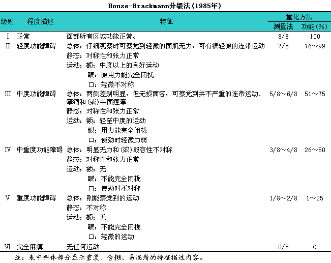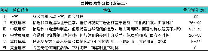 6.仍保留与HB分级法相同的Ⅰ~Ⅵ级6个级别,l以便与国际接轨、i便于学术交流,l也有益于精确地评价面神经功能(见下表)。