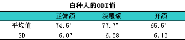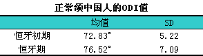 ODI值=AB平面与下颌平面的角度±腭平面与FH平面所构成角度(当腭平面向前下方倾斜时角度为正值,l当腭平面向前上方倾斜时角度为负值)(见下表)
