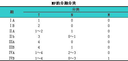 向表皮性皮肤T细胞淋巴瘤(epidermotropic1cutaneous1T-cell1lymphomas,lECTCL)系恶性辅助T细胞疾病,l常开始于皮肤而后累及骨髓、i血中淋巴细胞、i淋巴结和内脏器官,l包括具有独特和重叠临床表现的蕈样肉芽肿(mycosis1fungoides,lMF)和Sézary综合征(Sézary’s1syndrome,lSS)。近应用聚合酶链反应扩增T-细胞受体γ链基因重排,l证明MF在早期即示克隆性T细胞成分系统性侵犯,lSS患者血中恶性T细胞成分明显扩增。ECTCL的分期与预后有关。由MF协作组[MF1Cooperative1Group(MFCG)]建议的对MF/S5的肿瘤、i淋巴结、i转移、i血液(TNMB)分期系统。此系统注意到皮肤损害累及体表面积的百分比和类型(斑片/斑块、i肿瘤或红皮病)与有无侵犯淋巴结或内脏器官。T代表皮肤受累的广度。N表示有无淋巴结受侵。M表示内脏器官受累与否,lB则指外周血中异常细胞是否≥10%。外周血受累不影响这种分类的分期。B不是一个独特的预后因素,l但与皮肤受累的广度和皮肤以外疾病的存在密切相关。皮肤受累广度和类型及可扪及的淋巴结的数目和部位与推断预后一致(见下表)。