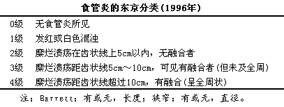 东京分类日本也提出了一系列RE分级标准,l如l973年食管炎研究会指定了规约,l1995年大津又提出修改意见,l直至1996年又重新修订了东京方案,l他们仍沿用以病理改变充血、i糜烂、i溃疡、i狭窄的4个阶段为基础,l分出5级(见下表)。1级的发红应是碘染后不着色,l以此与再生上皮相区别,l发红及白色这一级别是为了提高早期诊断和敏感性。附记内容与LA分级相同,l不将再生上皮的发红列为黏膜破损及糜烂之中,l而设0级是为了观察治疗效果。问题是在长度记载5cm、i5~10cm、i>10cm是否能如此准确,l黏膜发红、i白色混浊也会因操作者的主观判断而有差别,l因而会使重复性下降,l而此分类中将糜烂、i溃疡并列,l忽视了糜烂与溃疡病理学上程度的不同。